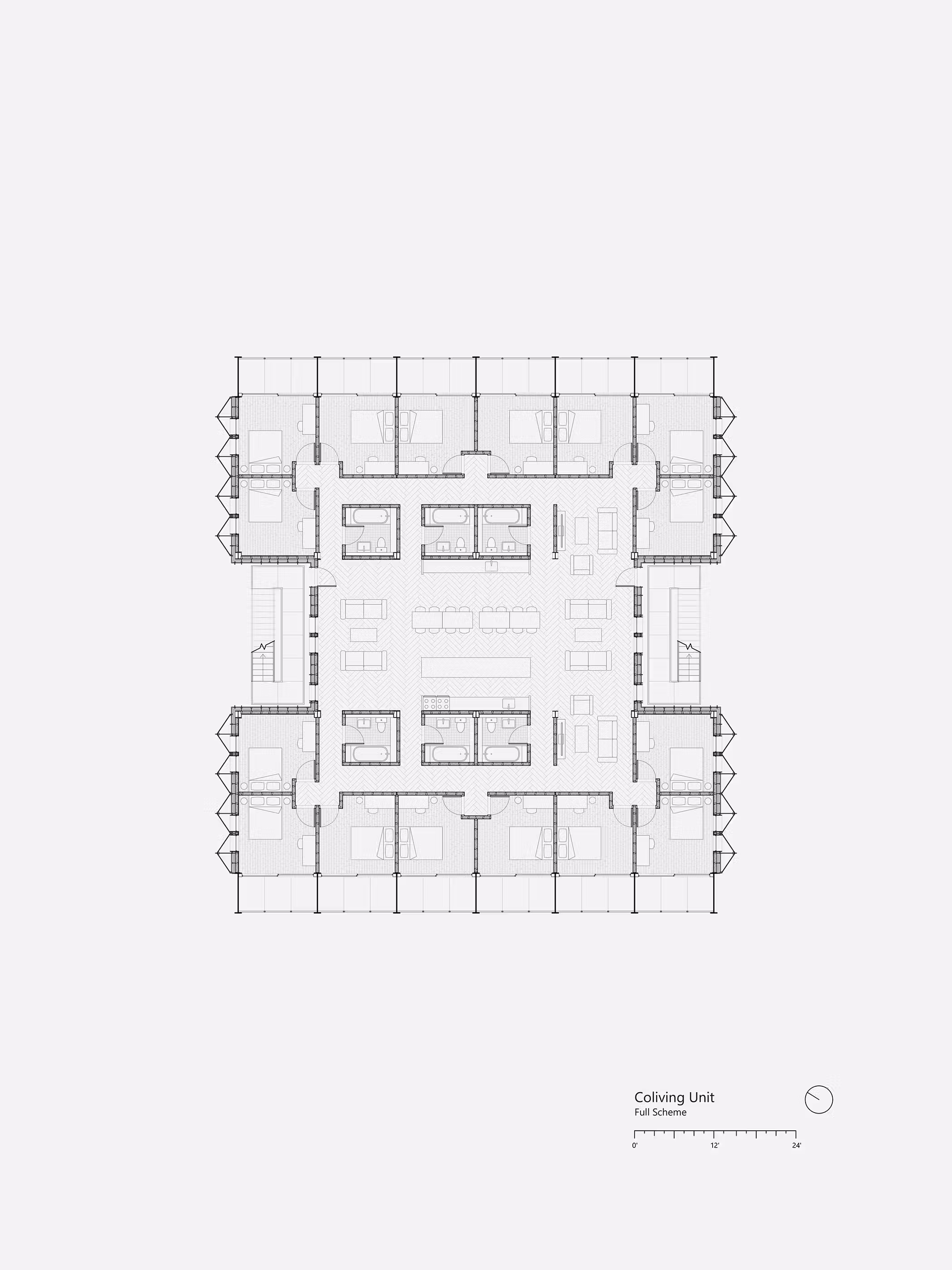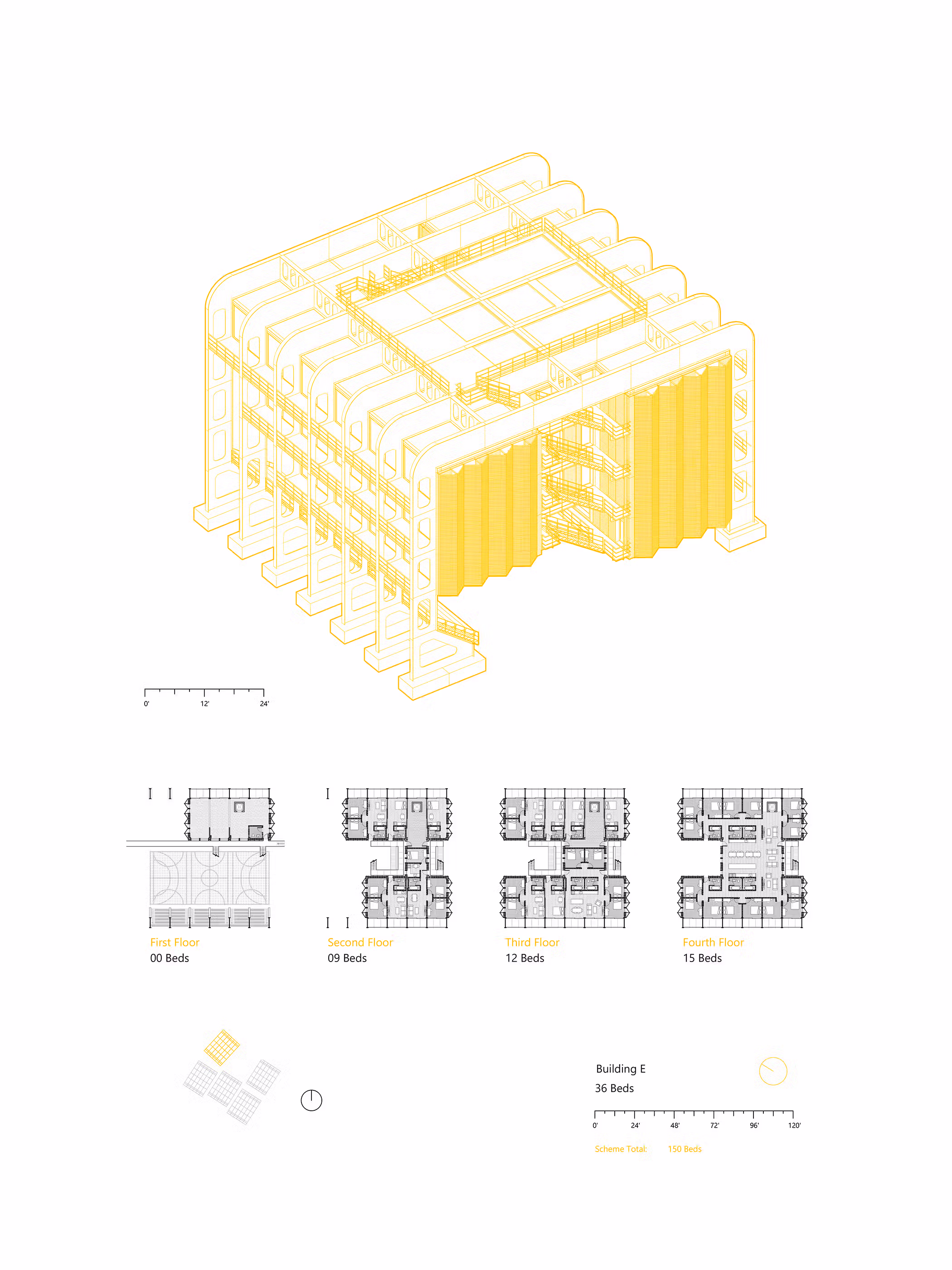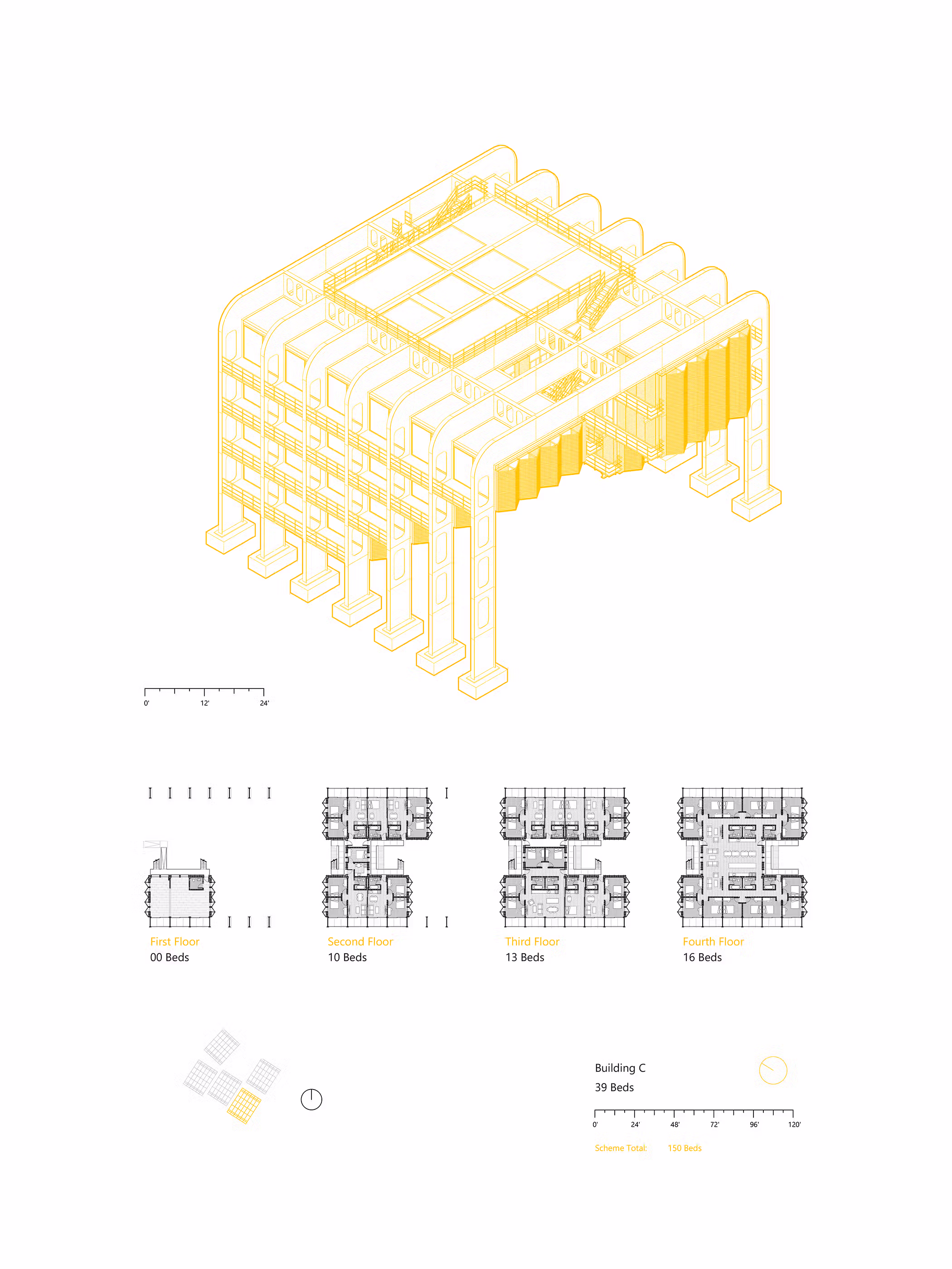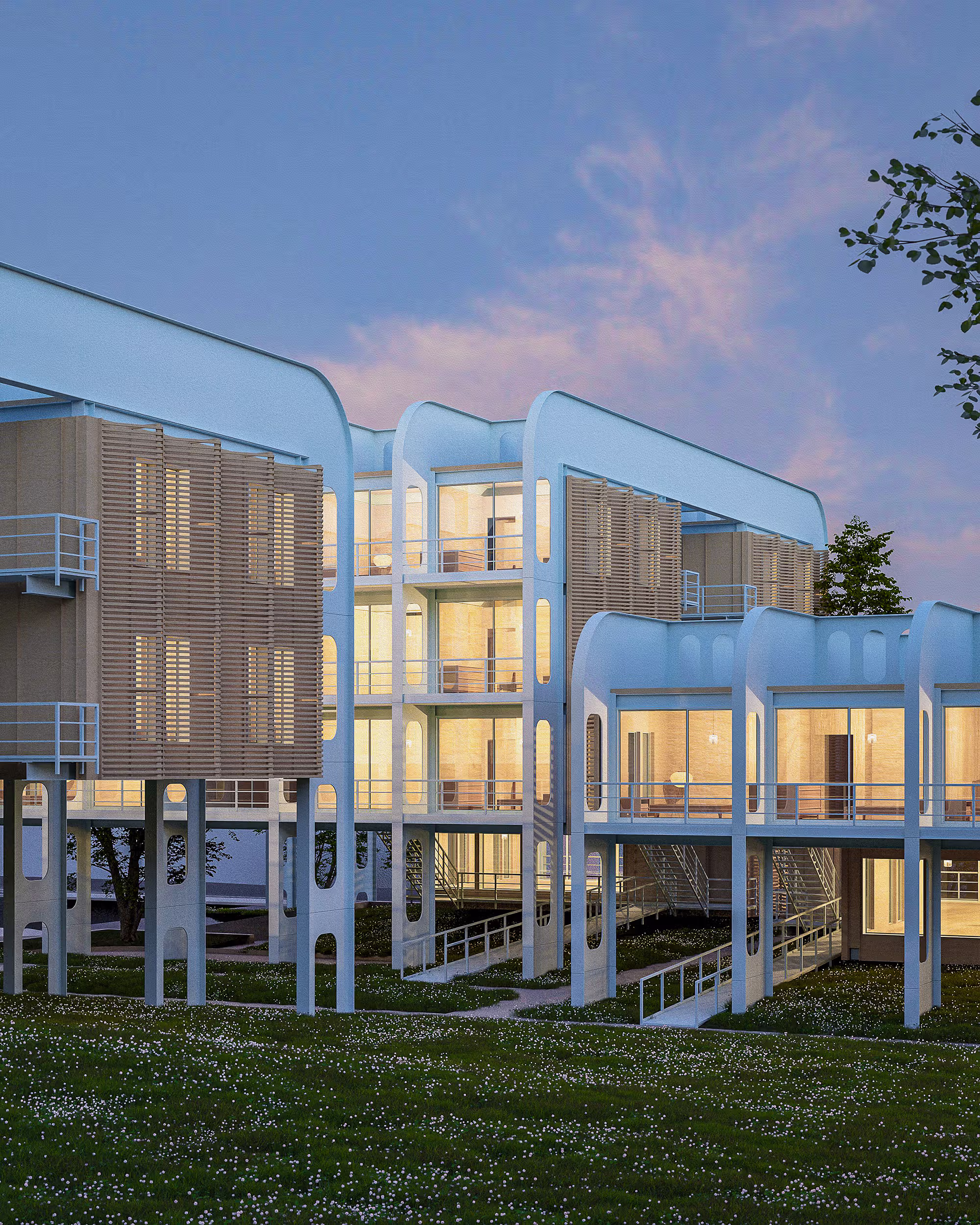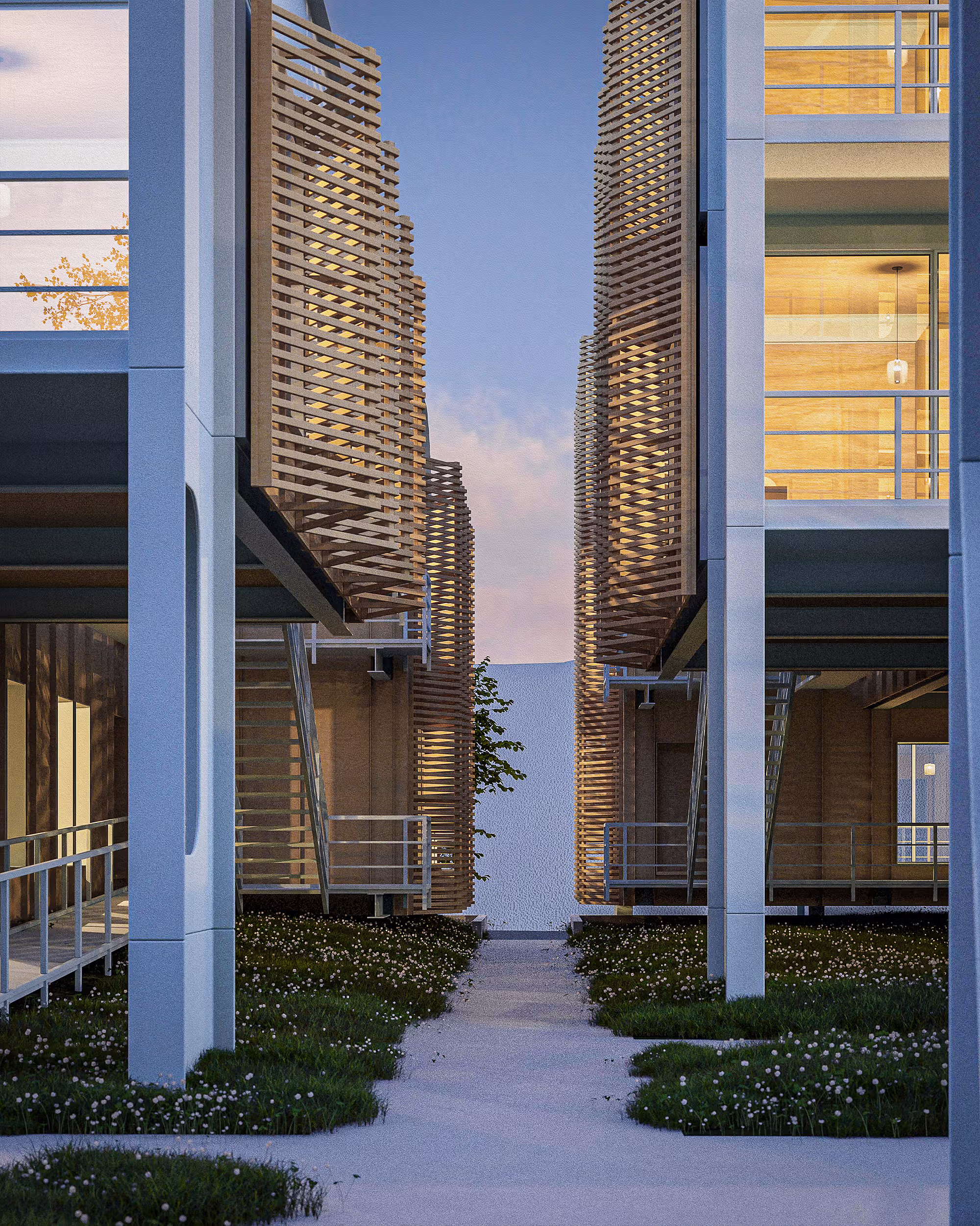 This project is designed to meet three possible future conditions, increasing threats to the climate, material scarcity, and shifting domestic needs. The modular unit design supports evolving living situations—expanding, contracting, or combining to meet the needs of individuals and families. The ground level is intentionally floodable, while the elevated steel frame resists deterioration, enabling long-term use despite environmental stress or limited access to new structural materials.