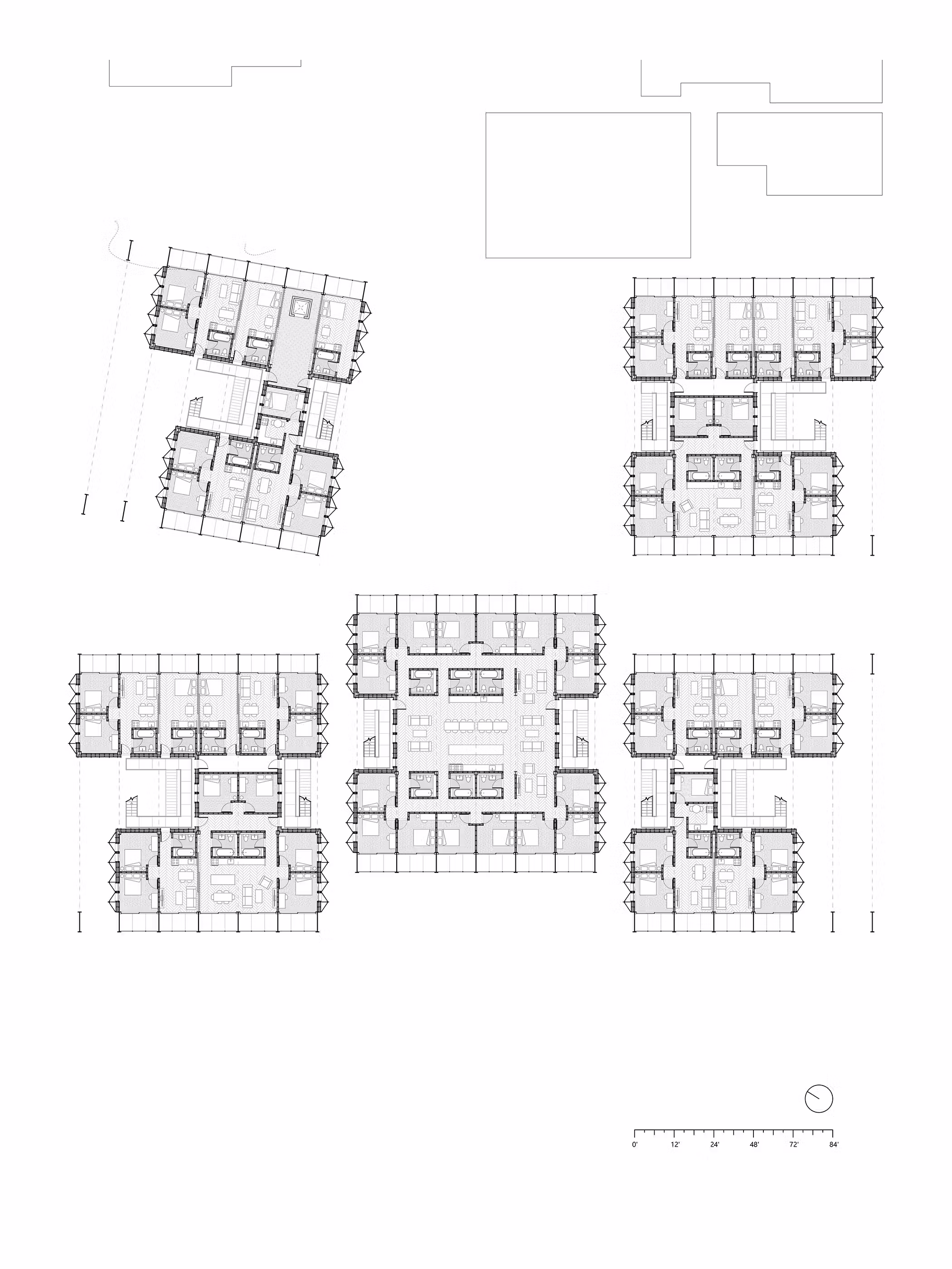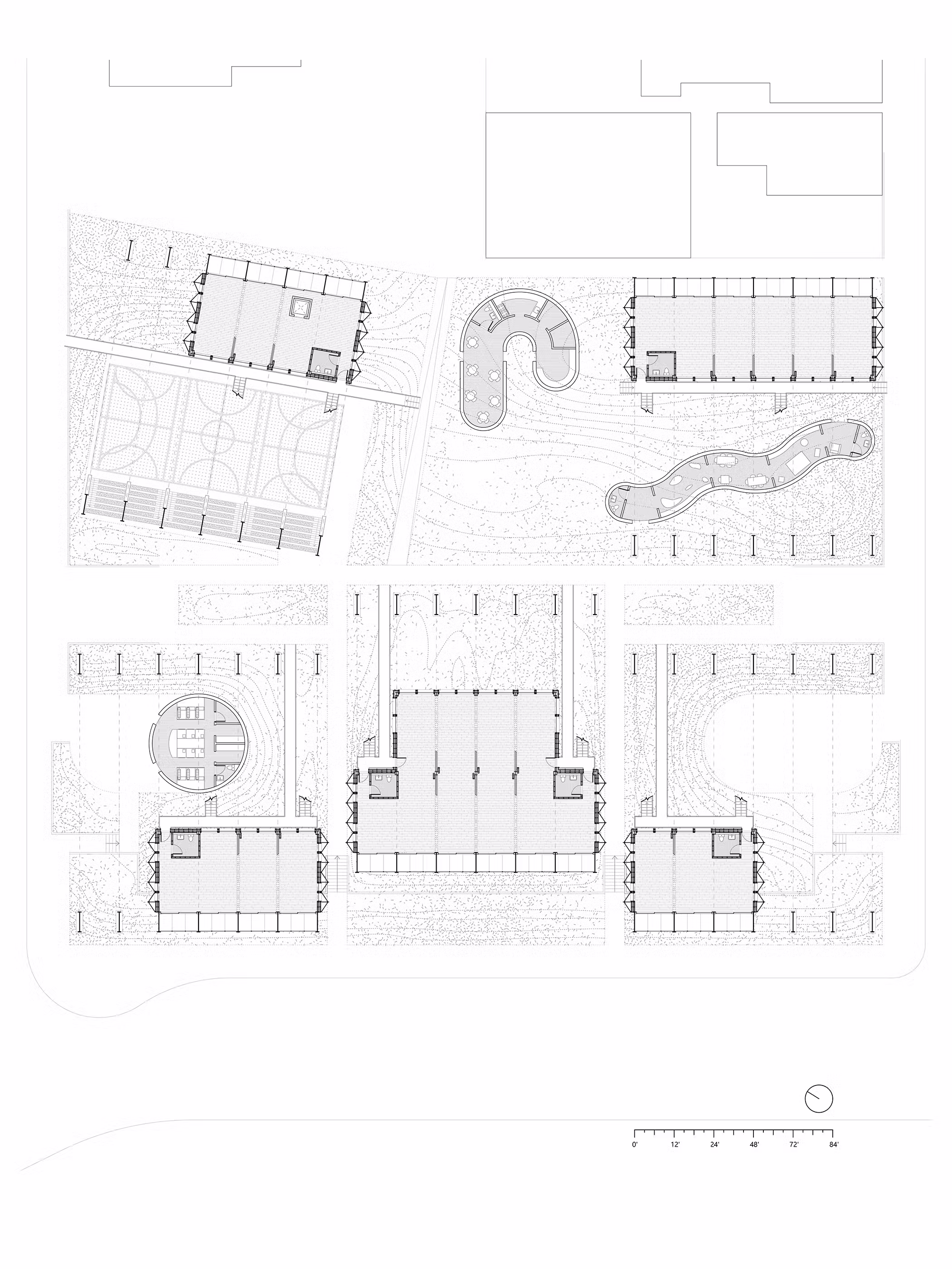 Dynamic green space weaves alongside paved walkways and pads to support flexible uses. It can transform into a shaded corridor during the week, a Sunday market on the weekend, and a place for pick-up basketball each afternoon after school lets out. The ground level remains open and adaptable, becoming a platform for everyday encounters and rituals. The arrangement of the five buildings encourages passage from the street to the commons and services beyond.