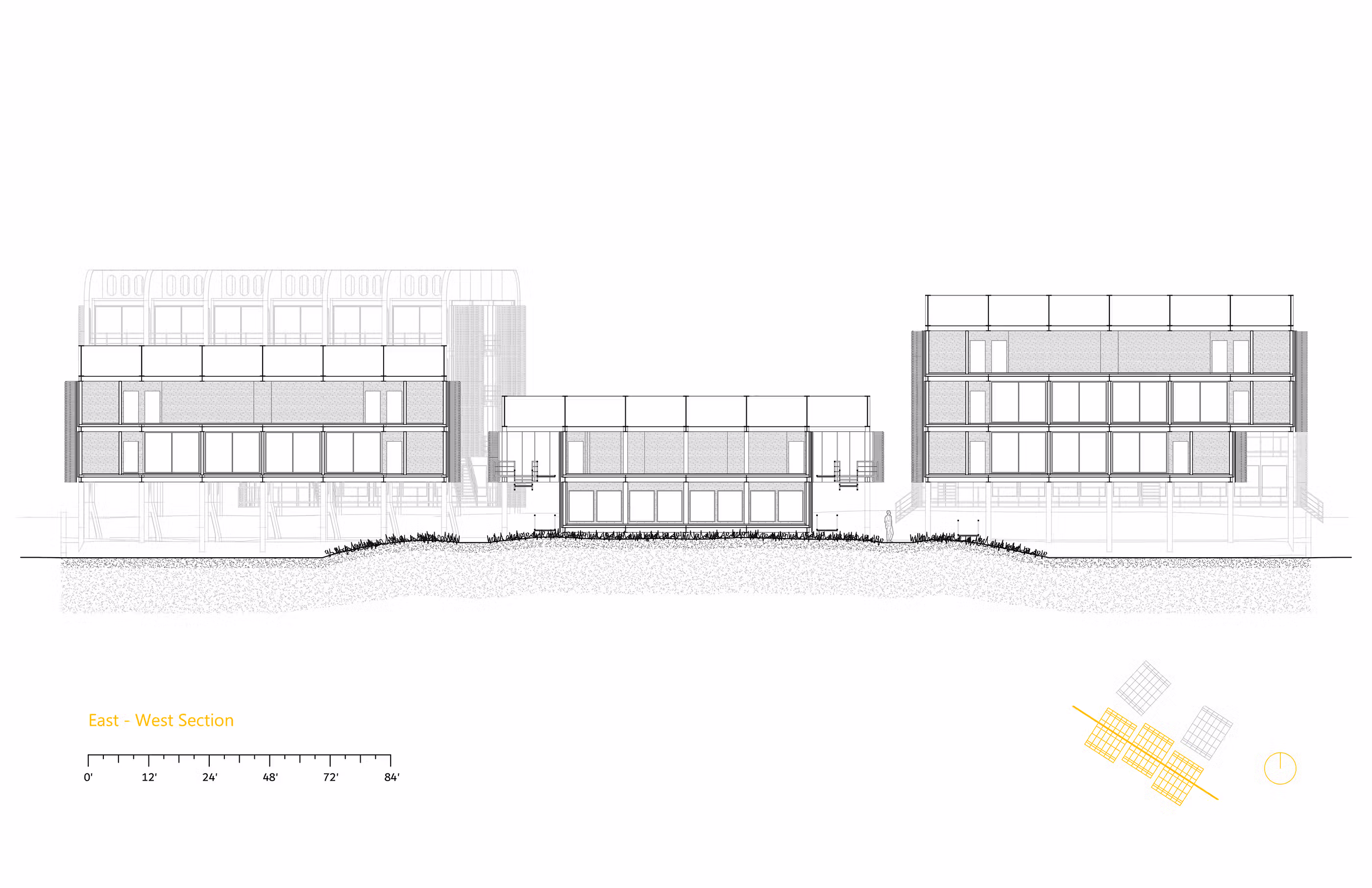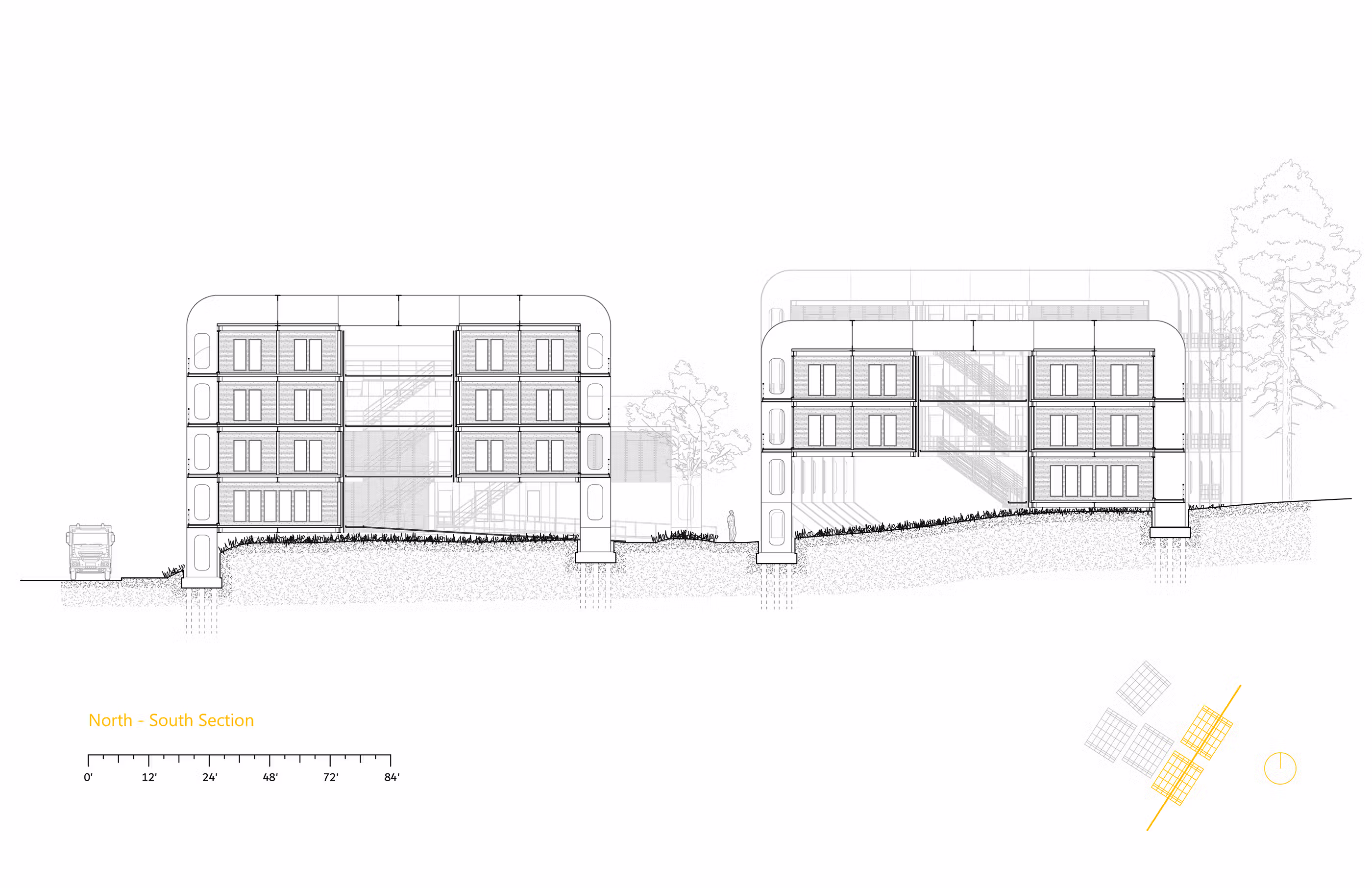 Five Cargo Holds are turned and brought onto site to support the 5 mixed-use buildings. As Marginal Street is a state designated trucking corridor, three buildings are positioned up against the Marginal-side site boundary creating both a physical and noise blockade between the outdoor community gathering spaces and the busy thoroughfare beyond.